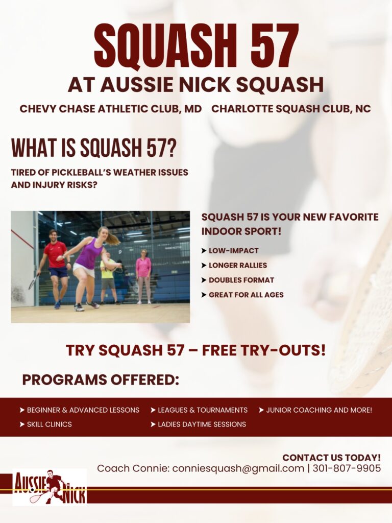AussieNick Squash is the brainchild of Rod and Connie Barnes. It provides a full range of all-year-round squash services at Chevy Chase Athletic Club for adults and juniors in Washington, DC, Virginia and Maryland. Since establishing in the US in 2002, AussieNick Squash has concentrated on developing an extensive array of activities and opportunities for players in the region. AussieNick Squash aims to satisfy the needs of its client base by the provision of information, equipment, training assistance and more. We provide access to an extensive junior program for all standards. AussieNick Squash programs are expanding to include input from an array of great full time and guest coaches. Squash Profile Jim Masland has been the Head Squash Coach at Aussie-Nick Squash for 6 years. Jim has worked as a professional coach for 20 years, instructing both at the college and club level. He was the Head Men’s Squash Coach at the University of Pennsylvania for three seasons (1996-99), as well as the Assistant Connie Barnes (conniesquash@gmail.com) is AussieNick’s COO and Director of Squash. Connie played Squash at State grade level in Australia for 15 years before arriving in Bethesda in 2002. An inaugural member of TPAC The Professional Association of Coaches and a USSquash representative, Connie is one of only 50 Level 2 coaches in the US. Connie’s Dr. Rod Barnes (aussienicksquash@gmail.com) is Aussienick’s CEO and part time elite coach. Rod learned squash through the 1980’s in Brisbane, Australia during a golden era where several of the talented juniors in his cadre went on to be some of the world’s top players.Rod’s squash career became secondary in his later teens as he chose a